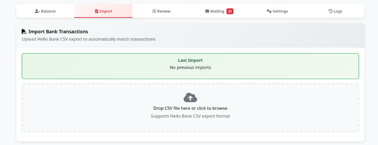 Automated Bank Integration - CSV import system for bank statements with automatic transaction matching - Smart algorithm matches bank transfers to users via structured references - Unmatched transaction queue for manual review and assignment - Transaction status tracking (matched, unmatched, ignored) - Import history with rollback capabilities - Duplicate detection preventing double-credit errors