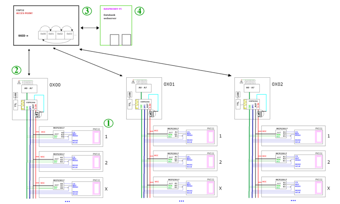 The system’s modular design makes it scalable and adaptable to different workspace sizes. Each control module can handle up to eight NFC readers connected via a shared SPI bus, keeping costs and power consumption low. All modules are built as custom-designed PCBs, programmed in C++ and designed for plug-and-play integration with minimal setup. A Raspberry Pi hosts the backend server, web interface, and database, simulating a production-ready environment for testing and future deployment.