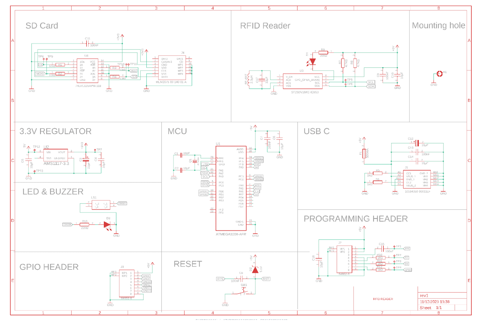 RFID/NFC Tag FunctionalityBuilt-in RFID coil, designed using eDesignSuite by ST-Engineering.Integrated with the ST25DV04KC RFID/NFC Tag IC, offering:16 KB EEPROM for data storage.Communication via the I2C bus.Data can be written to the tag using external devices, such as smartphones with RFID capabilities.Data Storage SupportIncludes a Micro SD card slot for additional data storage.Utilizes a 74LVC125 IC for safe voltage level shifting between the 5V logic of the microcontroller and the 3.3V logic of the Micro SD card.Power InputPowered via a USB-C port delivering 5V.Configured with 1 kΩ resistors on the CC pins to ensure USB-C standard compliance.Flexible Microcontroller IntegrationDesigned around the AtmegaXX08 series of microcontrollers, specifically the Atmega3208.Compatible with other ICs in the same series and package.ConnectivityProvides connectors for UPDI and UART for programming and debugging.Optional GPIO breakout for additional interfacing needs.