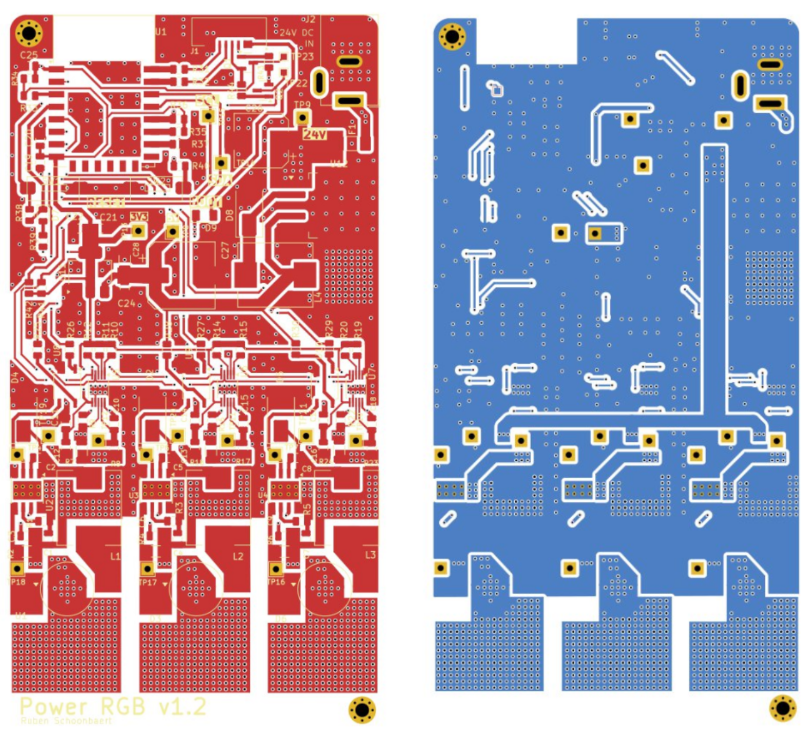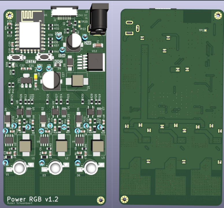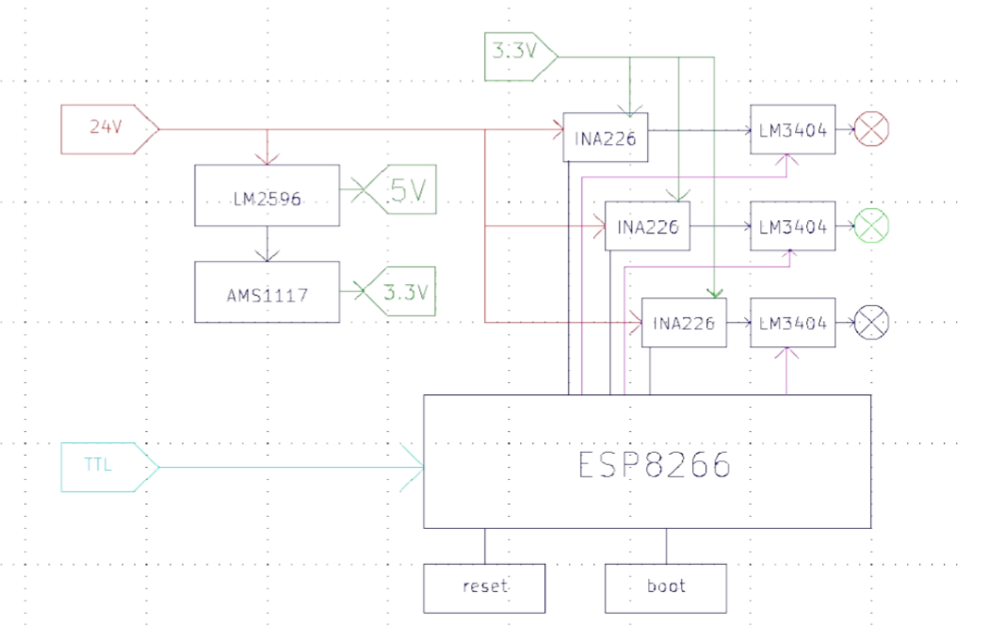 This repository documents the design and implementation of a WiFi-controlled RGB lamp using discrete power electronics and embedded systems. The lamp is based on 3× 5W LEDs (RGB), driven by LM3404 constant-current drivers, monitored by INA226 current sensors, and controlled by an ESP8266 microcontroller via a custom web interface.
