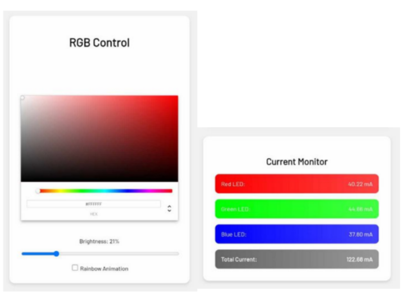 - User Interface: Web application hosted on ESP8266 for RGB control and power monitoring